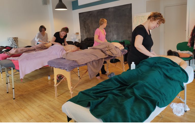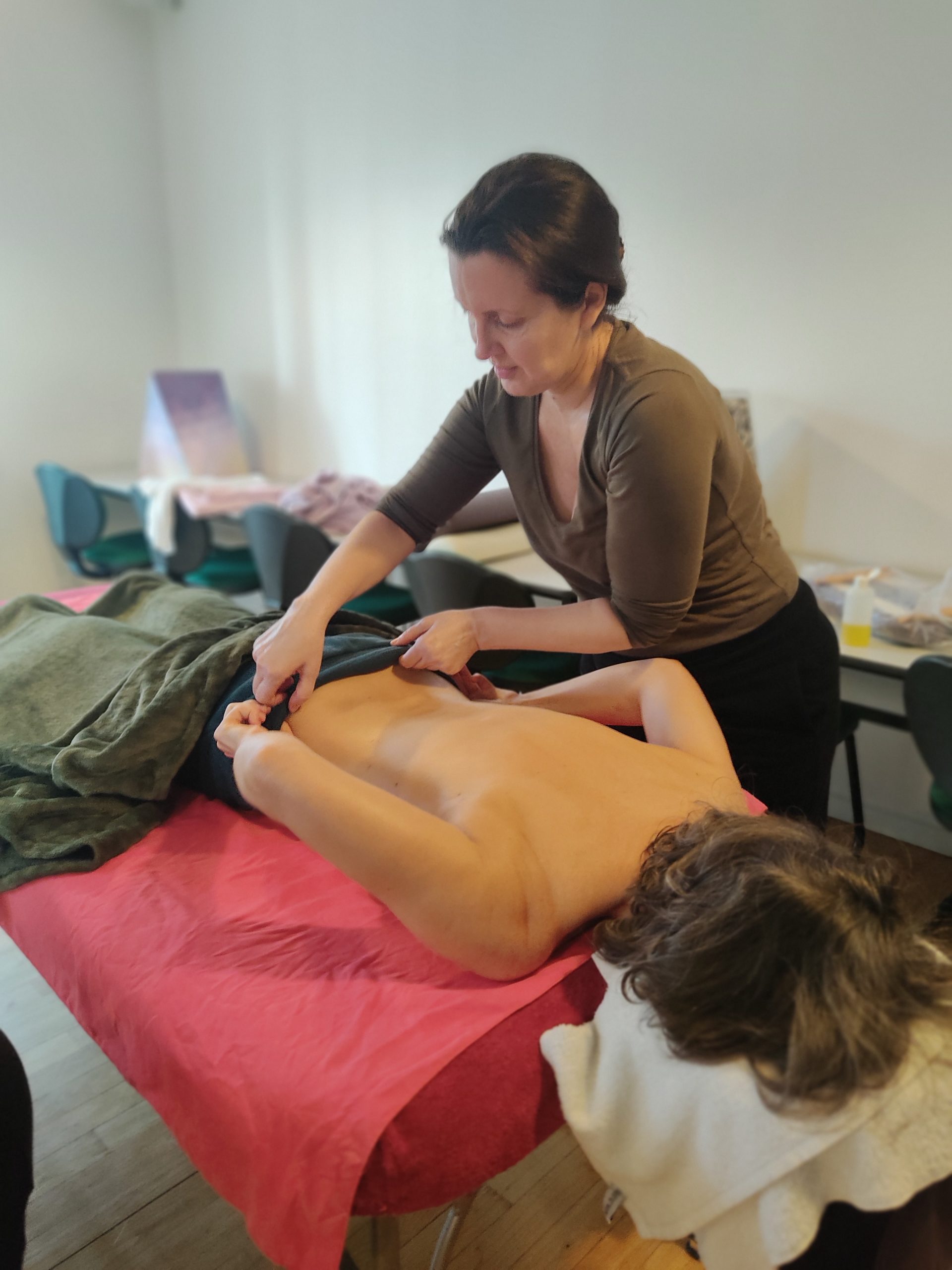Le protocole est coupé en séquence. La formatrice présente chaque séquence, puis un travail en binôme est effectué pour un apprentissage optimal. En fin de session, le protocole complet est déroulé par chacun des stagiaires qui donne et reçoit à tour de rôle.